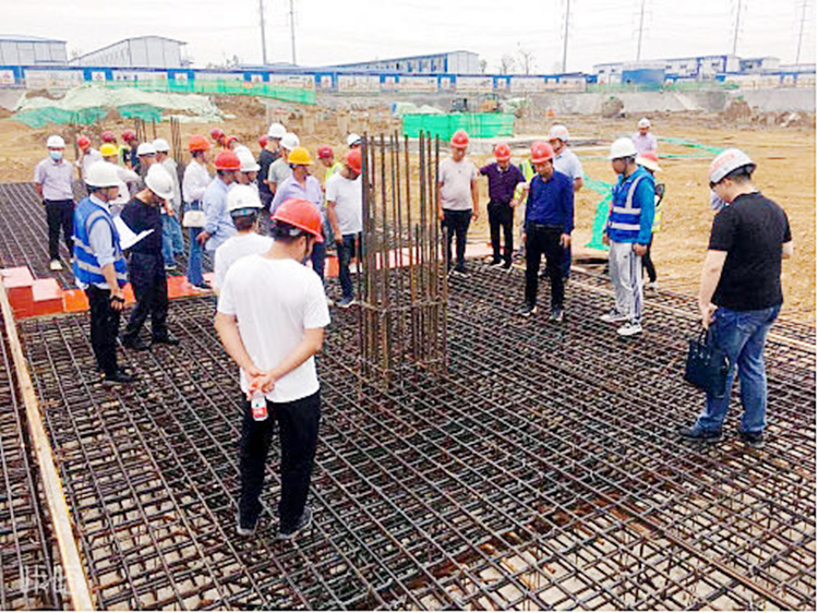 图为观摩团一行观摩现场钢筋绑扎工序
