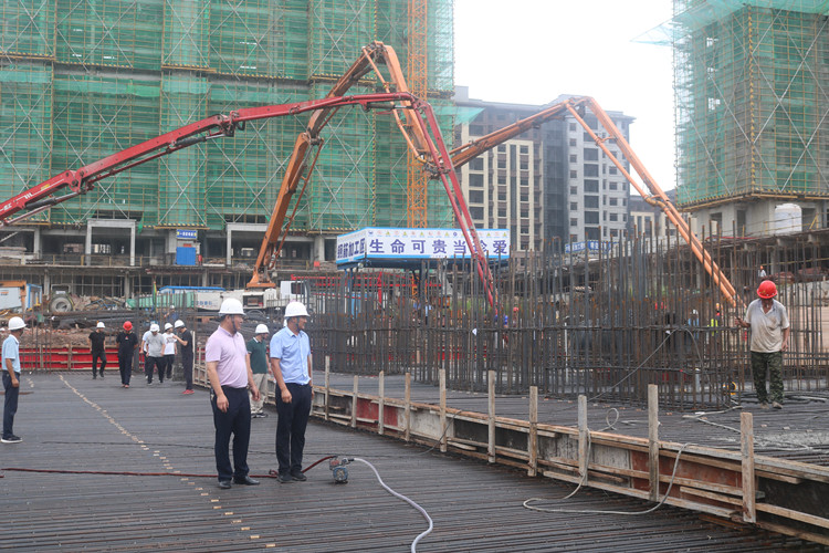 为推动分公司项目部之间的内部交流学习,进一步贯彻落实“战疫情、抢工期、保目标、促超产”劳动竞赛,洽逢金寨明发超高层项目进行大体积混凝土浇筑之际,8月11日上午,十一公司组织领导班子成员、各科室负责人、项目经理及技术负责共计30余人前往金寨明发超高层项目观摩学习大体积混凝土浇筑工艺。