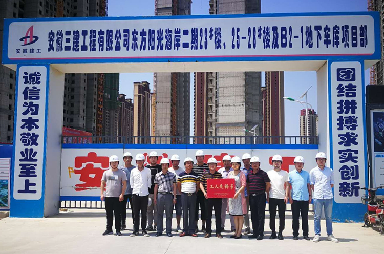 8月1日,安徽三建工程有限公司党委委员、副总经理陆勤斌,工会副主席马荣琳来大连公司烟台力高阳光海岸二期、三期项目部进行公司“党员先锋号”、“工人先锋号”创建工作考核验评,项目顺利通过验评,现场被授予“党员先锋号”、“工人先锋号”项目荣誉称号。烟台力高项目为公司2018年第一家“工人先锋号”授牌项目,也标志着本年度公司“工人先锋号”验评授牌工作正式启动。