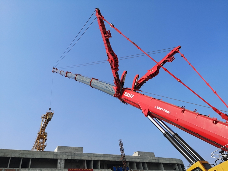 为了确保安全拆除,项目部和设备租赁公司密切配合,多次现场勘探,科学论证拆除方案,决定使用500吨吊车拆除。方案经过上报审批、质监站等部门审核确认。为确保拆除作业顺利完成,项目部和设备公司安排吊车提前一天抵达项目现场,设备租赁公司派出了两个班组,机上、机下配合组装和调试工作,为顺利拆除作业打下良好基础。