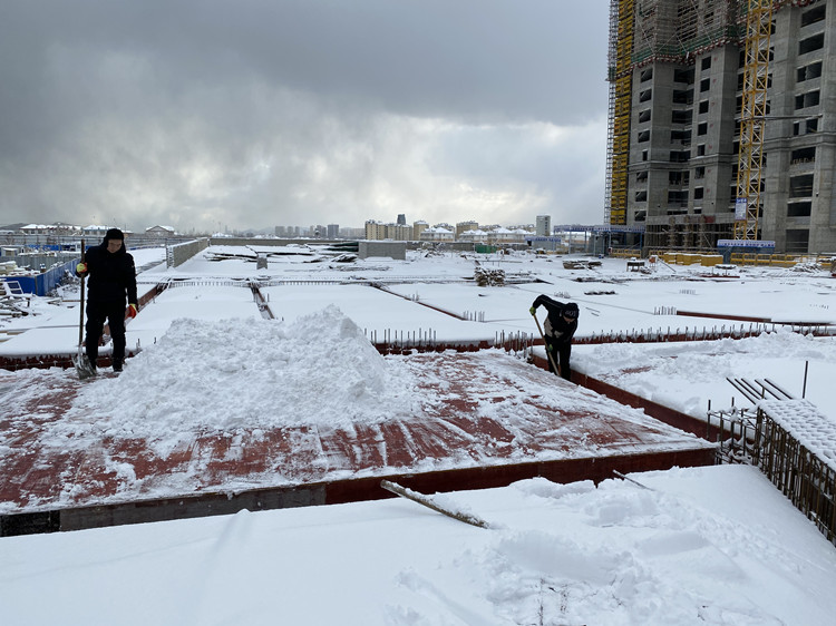当天,项目管理人员积极响应,无畏严寒,带上铁锹、铲子和扫把等工具赶赴施工现场,过程中大家配合默契,分工明确,零下五度却汗流浃背。很快道路、材料堆放场地、楼层顶板等积雪面积越来越小,工作面越来越大。
