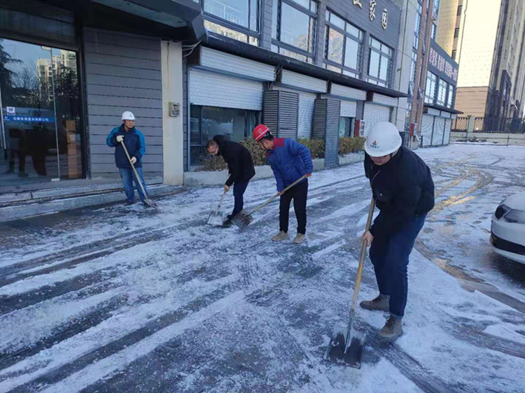 12月29日,安徽省经历了一场强降雪天气,地面上堆起了皑皑白雪。为保障安全生产和员工的出行安全,12月30日,十二公司滁州时代名邸项目部、滁州东菱项目部和肥东振兴EPC项目部积极组织开展铲雪除冰活动。室外的温度很低,路面的积雪被冻的得很严实,项目管理人员不顾天寒路滑,有的铲雪,有的扫雪,有的抛洒融雪剂,齐心协力扫雪除冰。经过几个小时的努力,路面积雪被清理完毕,道路也已打扫干净,工作面积雪被清除,为车辆及职工的安全出行,以及项目施工提供了保障。
