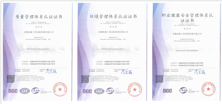 1月8日,安徽新鑫工程试验检测有限公司收到了由新世纪检验认证有限责任公司发来的质量、环境、职业健康安全三项管理体系认证证书,标志着安徽新鑫工程试验检测有限公司质量、环境、职业健康安全体系建设工作迈上新台阶。