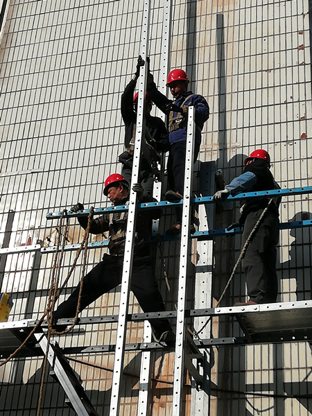 2月18日大年初七,轻钢龙骨公司厂区内一派繁忙,金加工车间主任陈金涛带领着师傅们正在紧张忙碌着安装升级版整体附着式升降脚手架(智能爬架)样机,经过三天的加班加点,顺利完成了3个机位的拼装和爬升,靓丽的新爬架矗立在轻钢龙骨公司大楼上,展示出蓬勃昂扬的新气象。