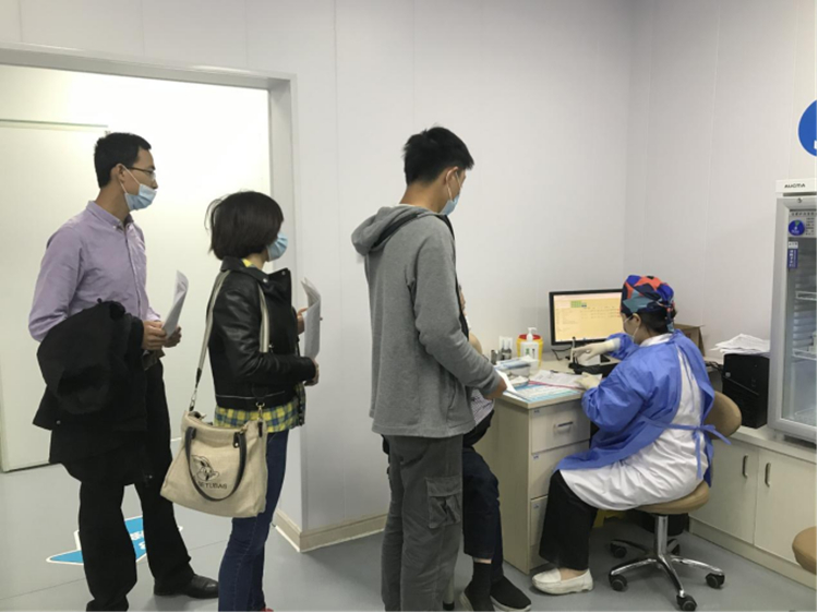 接种人员到达医院后填写《新冠疫苗接种知情同意书》,并扫描医院专属二维码登记建档,经简易体检查看是否符合接种要求,确认没问题后再进行疫苗接种。在接种完成后留观区观察30分钟,无异常反应后再由专车送回项目。
