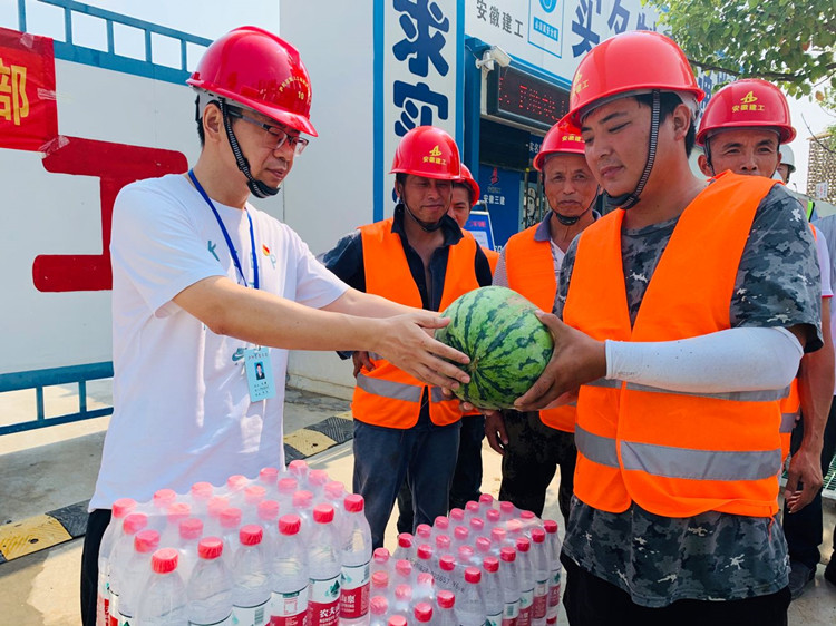 阮灏一行对工友表示慰问,向大家不畏高温、辛勤工作表示感谢,叮嘱大家要合理调整作息时间,确保身体健康,防止中暑,并为大家送来了西瓜、矿泉水等防暑降温慰问品;同时要求项目负责人要加强安全管理,合理安排施工工期,在保进度、保质量的同时,也要保障员工的身体健康,与监理单位切实做好防暑降温和安全生产工作。