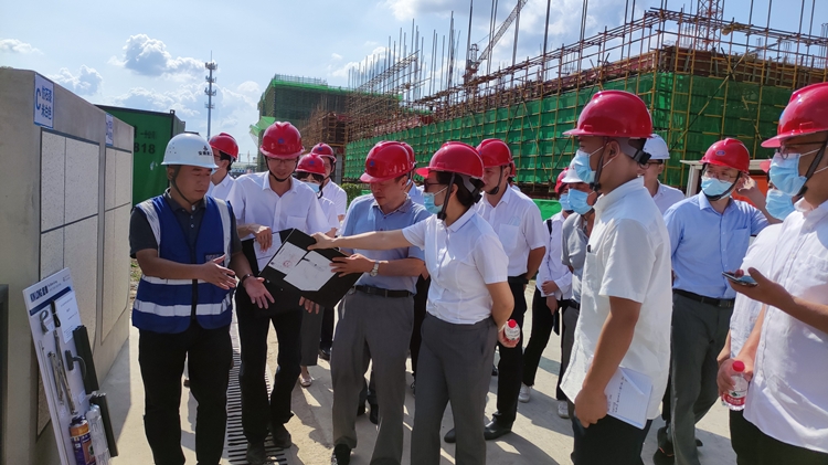 在施工现场,工投公司质量安全部对施工现场安全文明、质量管控、工期控制等进行细致的检查;调研检查组一行还观摩了项目装饰分部样板建设工作,了解项目真石漆样板、门窗样板有关情况。