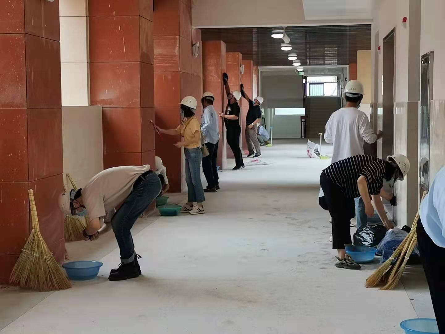 8月28日,装饰公司组织机关和各项目管理人员近40人利用周末休息时间开展义务劳动,对学校国际部进行了开荒保洁。领导率先、党员带头,大家一早来到工地现场,迅速投入到保洁工作中。清扫完后,大家观摩了该项目图书馆、报告厅、体育场、羽毛球馆、篮球馆和游泳馆等施工情况,了解场馆顶面、墙面以及地面的选材、设计和施工技巧。