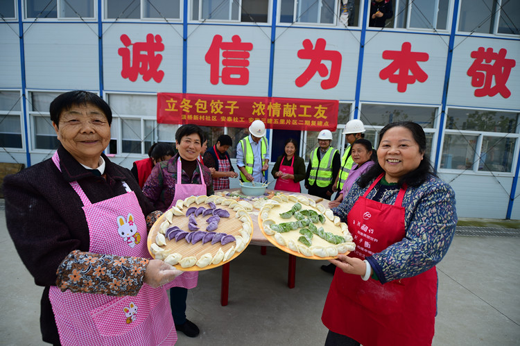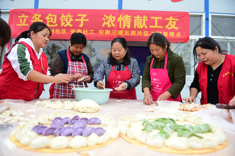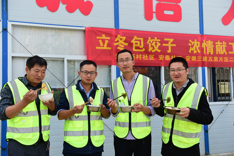 安徽三建五里片区项目临时党支部与汲桥社区志愿者联合开“立冬包饺子 浓情献工友”活动