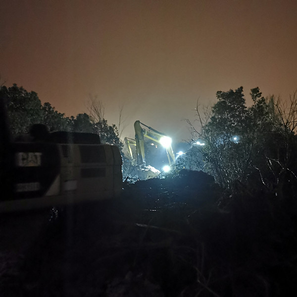 3月20日风雨交加的夜晚,花岗镇董岗健康驿站西侧周边的安徽三建12台挖掘机机臂上的灯彻夜亮着,30多名职工经过一夜艰苦鏖战,顺利将董岗健康驿站西侧河塘(原韩塘泄洪沟区域)积水引流至肖小河左支流下游,解决了花岗镇董岗健康驿站可能面临的积水内涝风险。