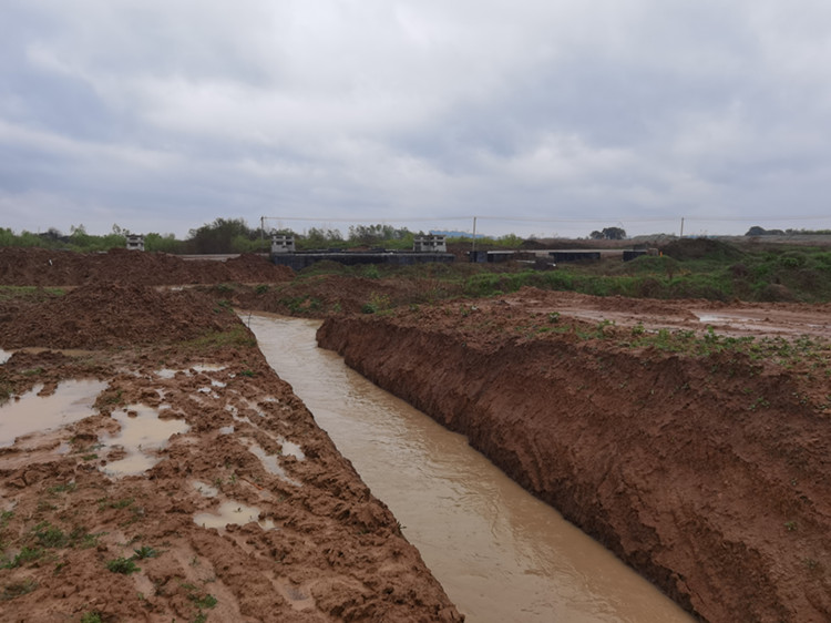 防汛现场,挖掘机在指挥下同时开挖沟槽,将河塘积水自董岗健康驿站北侧,顺梅城路到将军岭路,由北向南成90度绕开障碍物,引入肖小河左支流下游,共计沟槽开挖近400米。