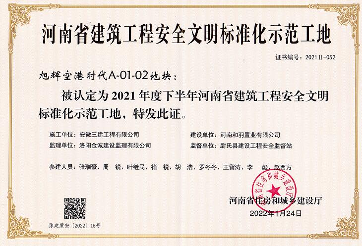 旭辉空港时代项目获评河南省“建筑工程安全文明标准化示范工地”称号