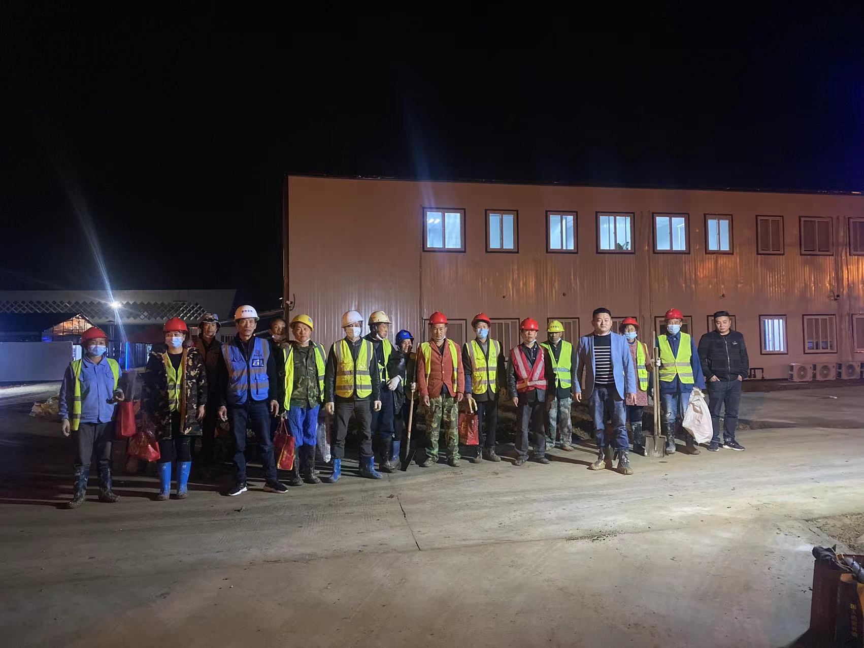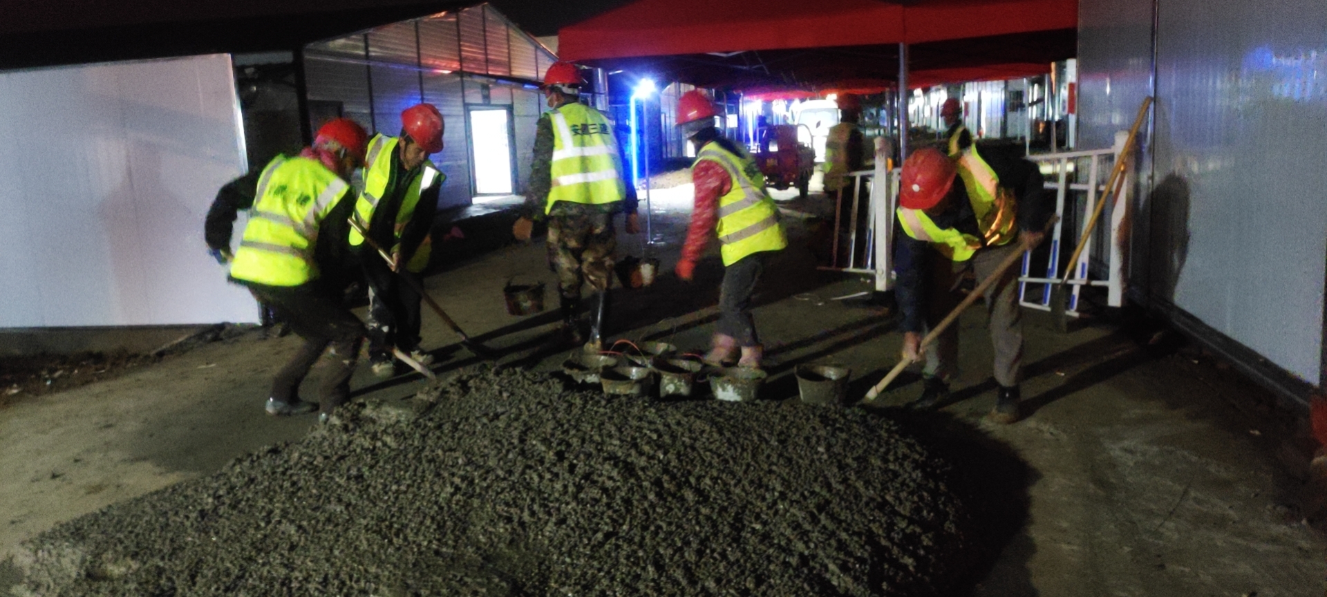 接到电话后,项目经理立刻组织管理人员和现场班组,短短10分钟内,有50名员工积极报名参与这个夜晚驿站建设的突击任务。晚上8:00,各队伍已列队庐江县健康驿站大门外集合完毕,与内部工作人员简单交谈后,得知现场主要困难是集水沟槽的无人砌筑,施工机械无法到达指定地点等,必须采用人工运输的方式进行材料运输。由于情况紧急,现场立即组织分工,经过长达几个小时的奋战之后,于凌晨1:20,庐江县健康驿站24栋建筑长达3万米的排水明沟全部砌筑完成,顺利结束了本次突击任务。