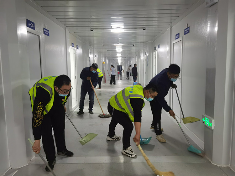 他们手持扫帚、拖把、铲刀、簸箕、水桶等清洁工具,以队为组、以区分工、以事分责,有的负责清扫,有的负责铲胶,有的负责拖地,有的负责擦拭,有的负责验收,一间间隔离室在大家通力合作、协同一致下,清扫完、关上窗、铺好床、熄灭灯、关好门。