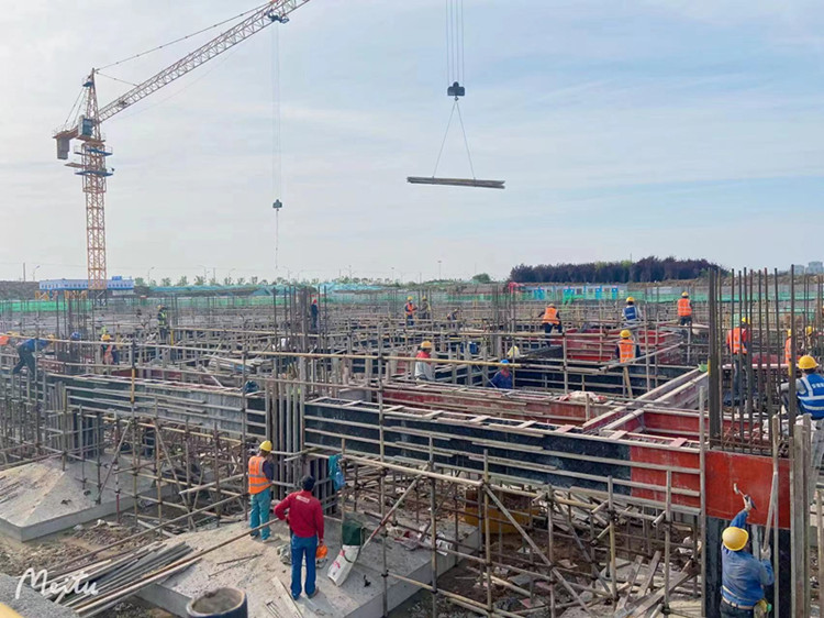 目光转至文化中心档案馆项目,120多名现场人员正有序施工作业,40名钢筋工不停地穿梭在负一层,他们双手并用,技术熟练,全面推进满堂架搭设与钢筋绑扎工作;再看那45名木工,分别站在各施工点位,安装、调整模板;瓦工、机械工、信号工每个操作工种都高效有序的完成他们心中的既定目标。