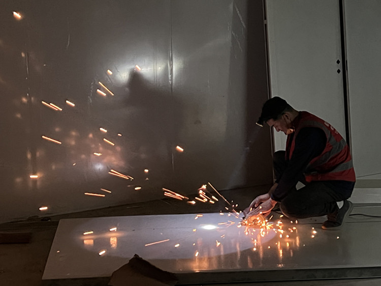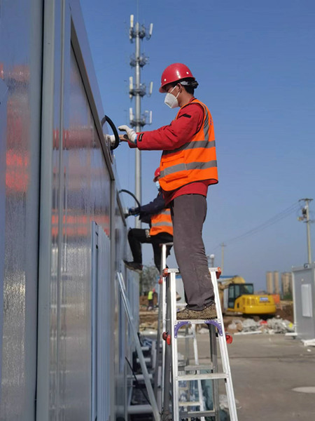 夜幕降临,合肥春天的夜晚仍夹杂着丝丝凉意,肥西县疫情隔离点备用区(三期)工程,塔吊在大功率的光源下仍进行着吊装作业,在吊臂下落的打包箱配件的不远处,二公司安全员任杉杉戴着安全帽,向着吊车司机喊道“慢、慢、慢”,在打包箱房顶配件缓缓落在箱房的支撑点之时,数名操作工立即手持电动机械找准各个支撑点位,用最快速度完成安装工作。