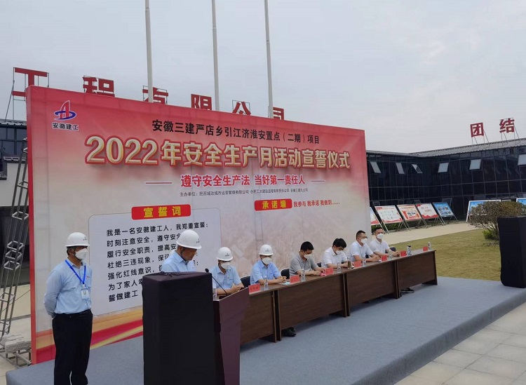 活动首先由项目党支部书记、经理李兵宣读“安全月”活动方案,建设单位副总、项目负责人胡运森,监理单位总监葛学祥,九公司党支部书记、经理陆军分别致辞并宣布“安全生产月”活动正式启动。致辞中表达了各方领导对项目安全管理的殷切希望,同时也望项目进一步加强安全生产管理工作,深入学习贯彻“新安法”。最后由分公司副经理姜茂平宣读应急救援演练预案,分公司副经理徐林海带领进行安全宣誓并进行签署安全承诺。
