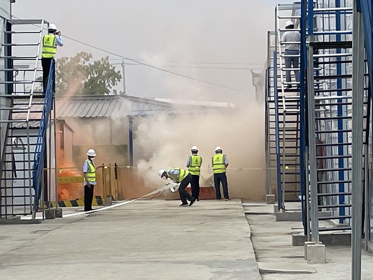 启动仪式后,项目开展了模拟违规使用大功率电器导致失火的消防演练与违章作业未佩戴安全带导致的高坠救援演练,演练参加人员进行了作业前的安全准备事项,现场人员的疏散,灭火器、消防栓的使用,应急处理措施、紧急绑扎以及应急救援上报等流程的演练。