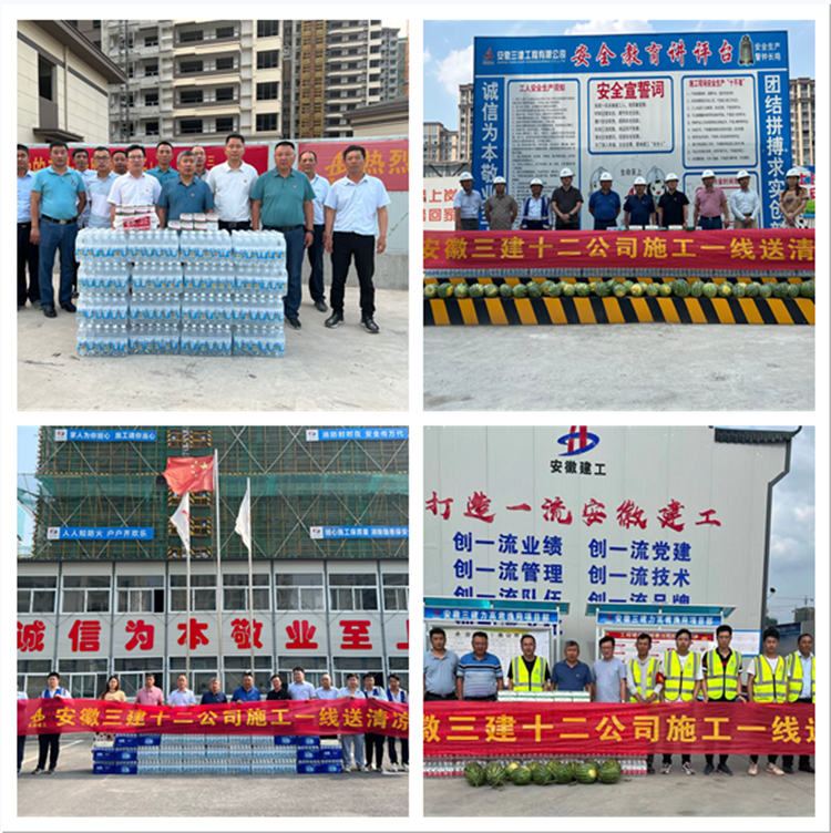 炎炎夏日送清凉,点滴关怀暖人心。为做好防暑降温工作,确保项目一线职工安全度夏。6月20日至6月22日,十二公司先后到滁州高速项目、蒙城高速项目、涡阳高速项目和六安力高项目开展“送清凉”慰问活动,带来了防暑降温的西瓜、矿泉水、十滴水等清凉食品和防暑药品,为奋战在一线的工人兄弟送上一丝清凉。