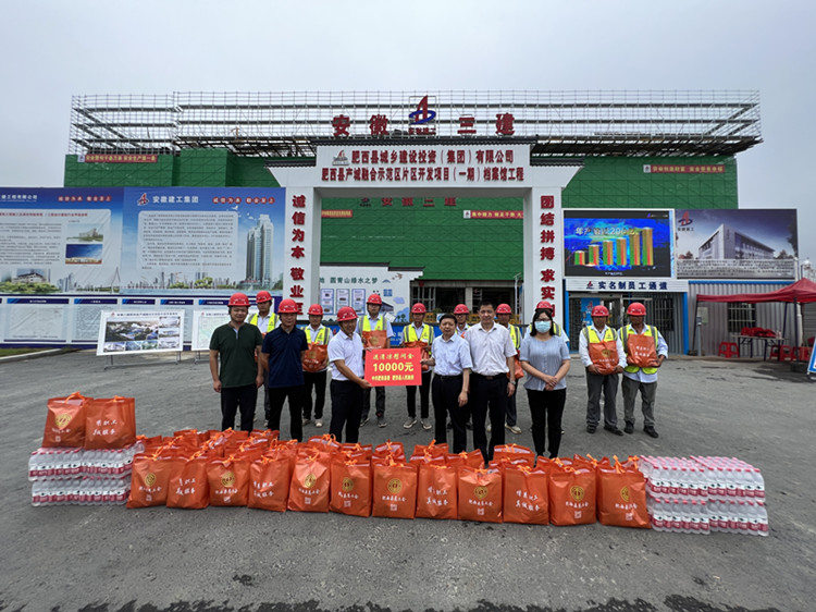 随后,成忠为项目建设者发放绿豆、矿泉水、毛巾、清凉油等防暑物资,并代表肥西县委县政府向项目送来“送清凉慰问金壹万元,详细了解职工的日常工作情况和高温劳动防护措施情况,对他们不畏酷暑,不辞辛苦的坚守表示致敬。他叮嘱,项目建设者要做好防暑降温措施,保障自身的安全健康,项目要合理安排作业时间,加强防暑降温、劳动保护知识的宣传,为高温天气户外作业职工避暑休息提供便利,创造安全、健康、和谐的工作环境。