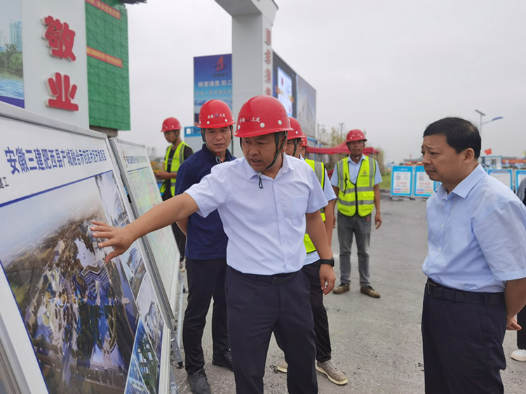 成忠一行听取了肥西县产城融合示范区开发项目的建设情况及进度,肯定了安徽三建在肥西县总工会组织开展的“建功十四五,奋进新征劳动竞赛中,展现出的技术精湛、施工严谨、质量优先、协同高效等作为省属国有龙头施工企业应有的综合实力。
