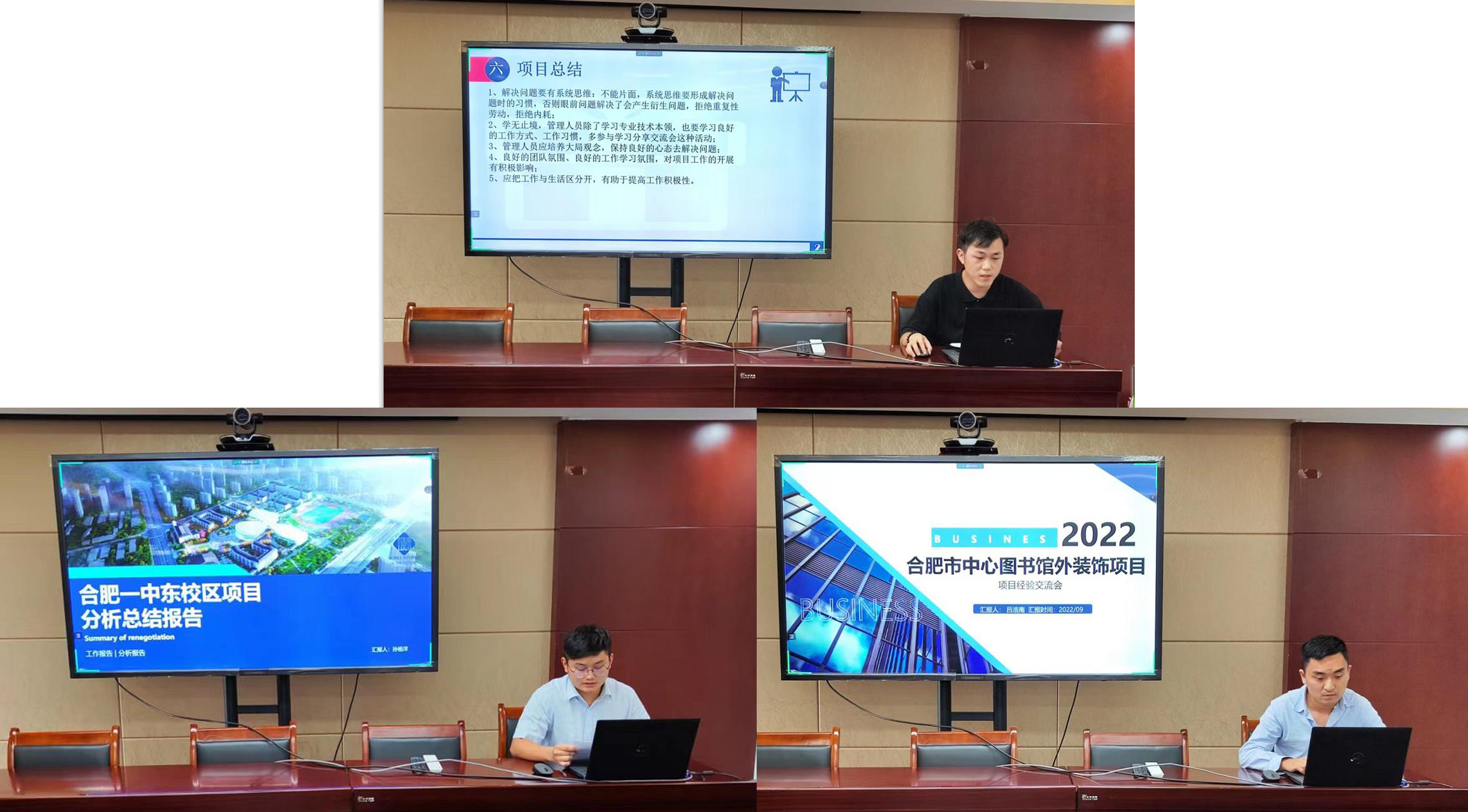 会上,五名同志结合项目实际作了精彩的交流发言。六安一中内装饰项目技术员程绍伟、合肥市中心图书馆装饰项目技术负责吕浩南、合肥一中东校区装饰项目技术员孙杨洋通过工作中的实际案例,总结工作中的经验和不足。肥西产融装饰项目经理徐俊作了应急工程施工经验分享,主要从方案策划、人员组织、物资调配、成本管理、后勤保障等方面作了详细的讲解。随后,装饰公司质量科长周桃香分享了《如何提高技术标编制水平》,结合相关典型案例展开分析讲解,图文并茂,加深了投标人员对技术标编制技巧的理解。为了激励年轻人快速成长,此次走上讲台分享工作心得的大多为年轻职工,交流会赢得职工的阵阵掌声。