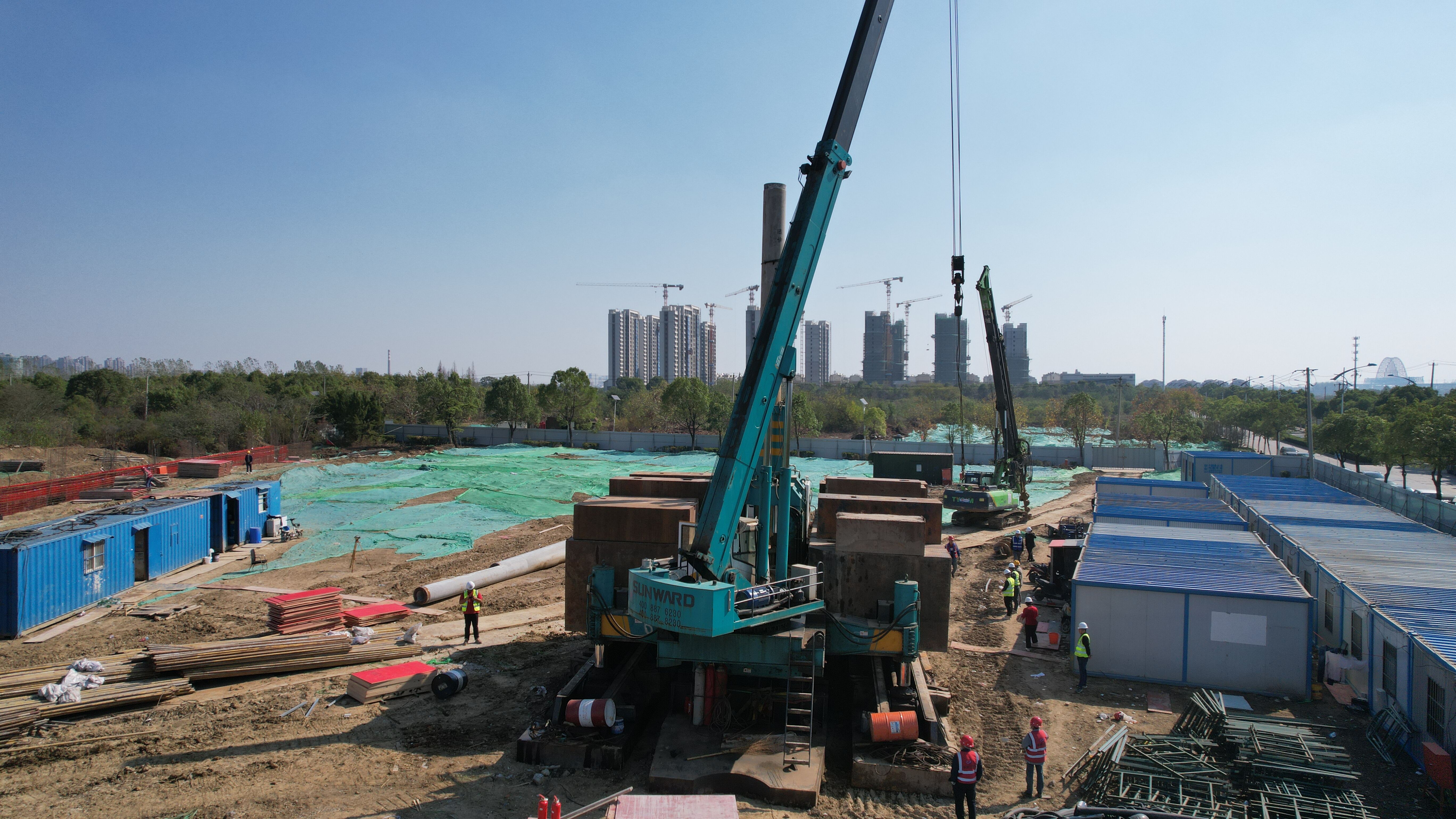 合肥一中淝河校区项目在做好疫情防控的前提下,如火如荼地开展施工作业,工作人员不畏艰苦,攻坚克难。12日上午,第一根试桩开始进行打桩,施工现场其他工作也在有序进行中。
