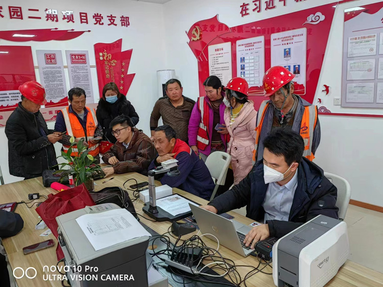 为保障新进场农民工工资年前正常发放,日前,八公司大圩金葡萄二期项目部专门联系银行业务人员来到项目部现场为农民工集体办理银行卡。
