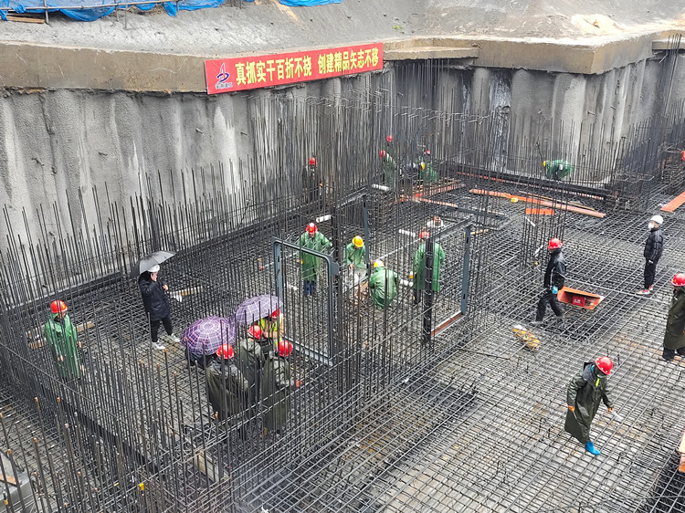 自2022年9月项目正式开工以来,项目克服了疫情封控、扬尘管控、土方外运难、地下管线拆改、施工及交通环境复杂等一些列施工难题,紧锣密鼓开展生产。2023年初,项目接到业主单位下达春节前停车楼筏板基础完成的节点目标,项目部第一时间部署抢工工作,面对复杂的劲性混凝土人防工程,项目部管理人员与各班组劳务人员展开为期十天的劳动冲刺,采用日夜两班倒、停人不停机抢工模式,终于在15日凌晨完成停车楼筏板最后一方混凝土浇筑,耗时11个小时,顺利完成年前施工任务。