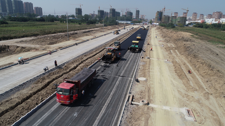 为了确保长春东路项目主体结构工程国庆期间全线贯通,十一国庆节期间,市政公司分管领导现场带班,项目部全体人员加班加点,按照计划安排,增调机械设备,调整施工力量,全力以赴保障道路路面、桥梁等施工建设稳步向前推进。国庆节期间已完成K0+070~K1+200段两层沥青面层的摊铺工作,全线已完成接近90%的主车道水稳三层基层摊铺工作,辅车道也在稳步施工中。