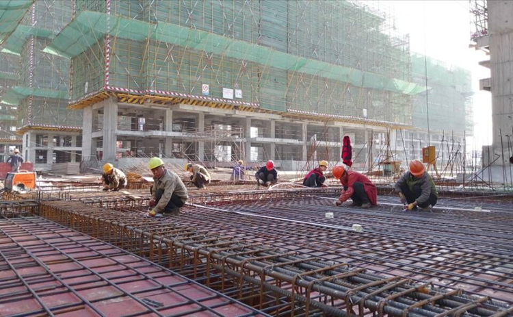 八公司临泉银杏苑项目:工人师傅轧钢机、支模板,大家各司其职、相互协作。