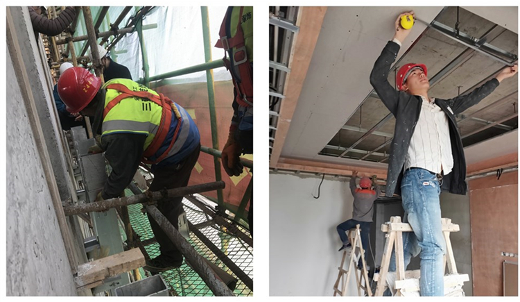 装饰公司肥东政府中心项目:五一期间正在开展主龙骨角码安装作业以及铜川悦豪酒店项目职工进行顶面木制作。