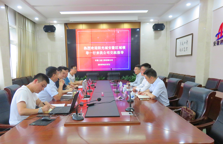 2019年6月17日,阳光城地产安徽区域总经理蒋必强一行3人来我司调研考察。公司党委书记、董事长左登宏、党委副书记、总经理何洪春、副总经理刘顺利接待考察,公司大客户事业部负责人及相关人员参加了调研座谈。