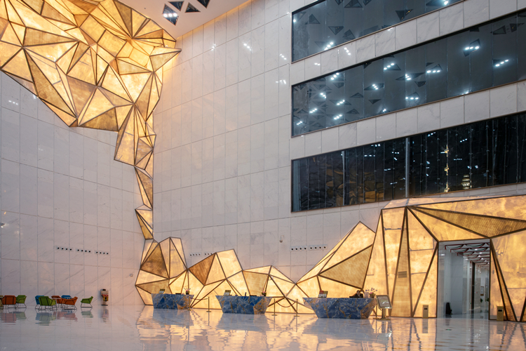 大堂是五星酒店装饰的焦点,也是铜川悦豪工程最困难的地方。为了呈现独特的光照效果,大堂大面积采用不规则、多层次转角透光云石装饰。云石单块最大重量超过200公斤,安装精度要达到2毫米,才能确保装饰效果,而这些都要在24米的空中进行安装,困难重重,业主方也心里没有底。