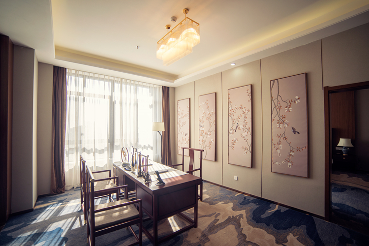 五星级酒店功能齐全,装修风格多样,包括国际宴会厅、餐包、大会议室、贵宾接待室等功能区域,以及总统套房、关中印象房、爱琴之海房等多种风格迥异的主题客房,涉及装饰材料种类多达几百种,为了保证效果,项目部对每种材料都精心挑选和检查,以确保质量、色彩、效果符合设计要求。