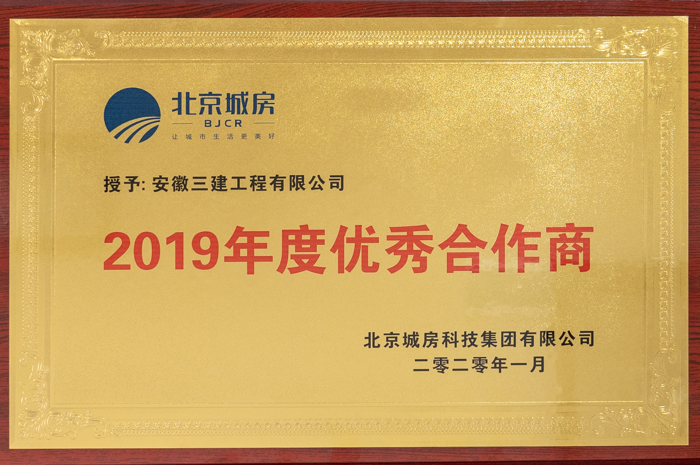 1月14日下午,北京城房集团在合肥滨湖白金汉爵酒店举行的2019年度城房集团优秀供应商表彰大会,安徽三建荣获2019年“优秀合作商”荣誉称号,并获得20万元奖励。