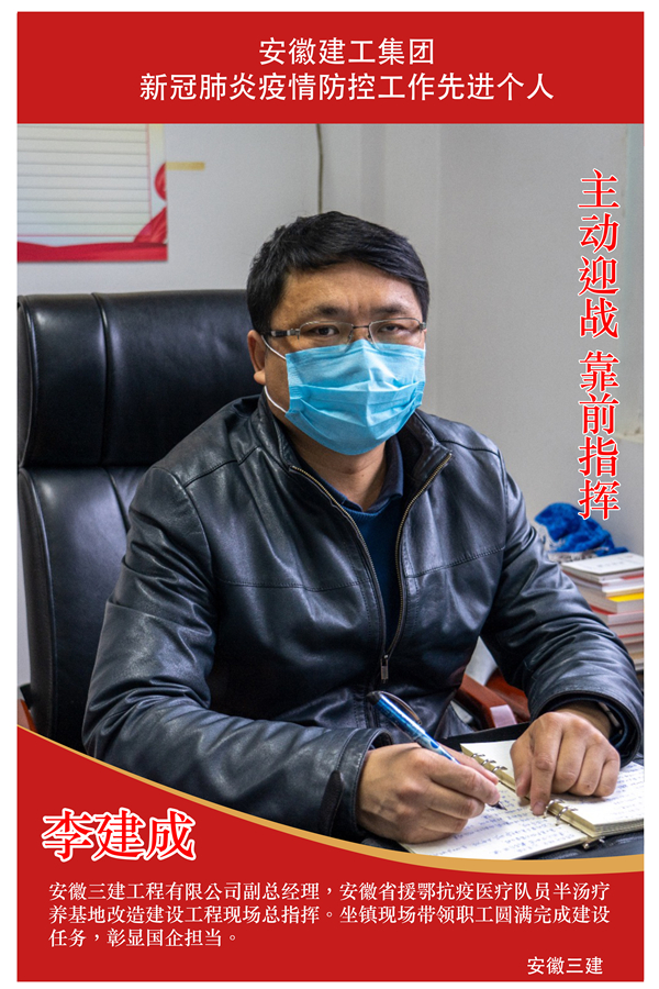 李建成,安徽三建工程有限公司副总经理,安徽省援鄂抗疫医疗队员半汤疗养基地改造建设工程现场总指挥。在攻坚抗疫应急工程的战斗中,他勇担责任,靠前指挥,连续14天坐镇现场指挥调度,迅速解决现场遇到的材料供应和劳务人员组织、出行、防疫物资供给等困难,为按期圆满完成省援鄂抗疫医疗队员半汤疗养基地改造工程起到了关键性的作用,彰显了国企领导的使命担当。