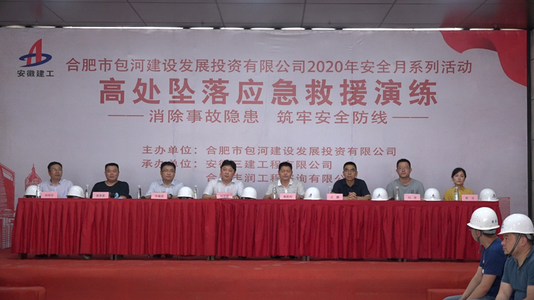 6月15日,一场高处坠落应急救援演练活动在安徽三建公司葛大店幸福城A区项目开展。救援演练活动由合肥市包河建设发展投资有限公司主办,安徽三建工程有限公司与合肥丰润工程咨询有限公司承办。包河区住建局副局长郭胜利、包河区住建局质安站监督科科长祝星星、包河建发副总经理王鹏、安徽三建公司党委副书记、总经理何洪春、副总经理李建成、合肥丰润工程咨询有限公司有关领导观摩了演练活动。