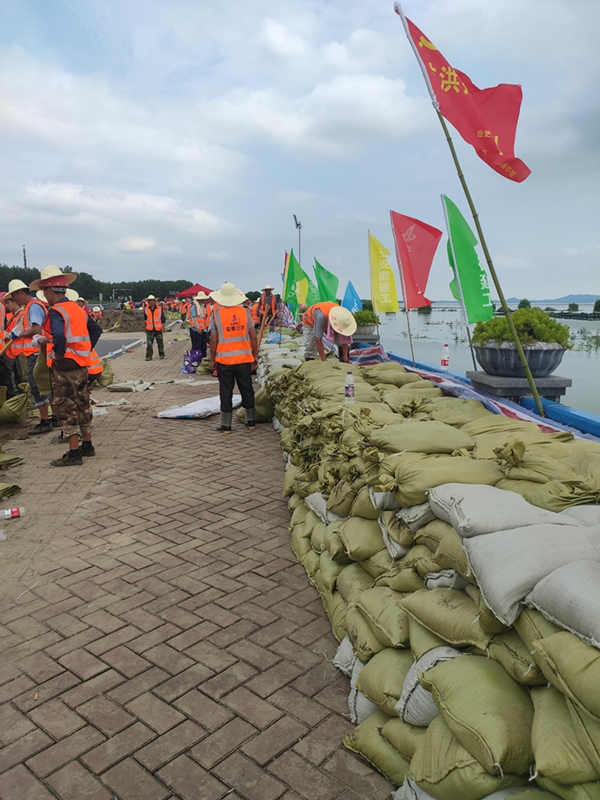在连续奋战三天后,合肥雨势暂歇。然而未及休整,23日早7:30分,公司接到合肥市包河区相关单位紧急通知,前往环湖北路十五里河桥以东200米处抢险。公司立即组织行动,组织协调一分公司、三分公司、六分公司共计约120人,顺利抢筑堤坝150米。