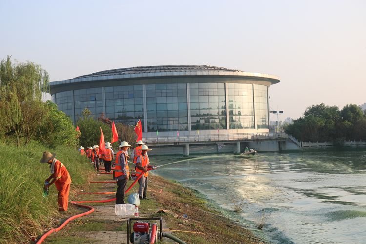当天,一大早,70多名党员、职工就赶到巢湖环湖北路塘西河大桥边,现场成立了三支党员突击队,大家头顶烈日,冒着37摄氏度的高温,投入到治理蓝藻攻坚战中。大家沿湖开展集中作业,连续抽取湖水投放杀藻剂或絮凝剂,再排放回湖中。在蓝藻治理活动中,广大党员、团员勇当先锋,连续工作12小时, 大家的工作服干了又湿,湿了又干。十二公司青年党员曾祥军同志说:“八百里巢湖是合肥的名片,是合肥市宝贵的自然资源,能够参与到巢湖蓝藻治理中,做保卫环境的战士,义不容辞”。